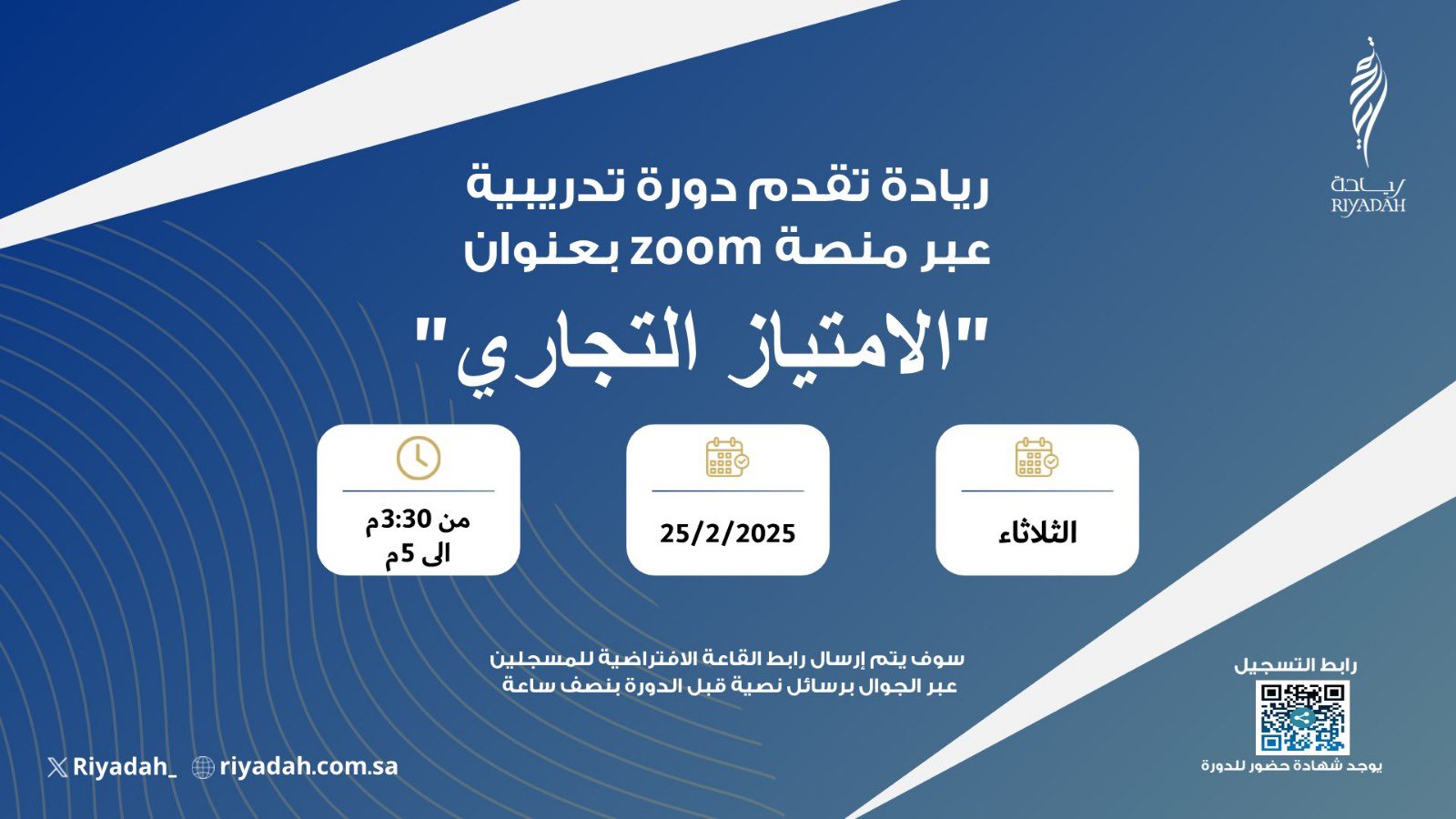 يعلن معهد ريادة الأعمال الوطني (ريادة) دعوته لروّاد ورائدات الأعمال والمهتمين بريادة الأعمال لحضور دورة تدريبية (عن بُعد) عبر منصة (Zoom) بعنوان (الامتياز التجاري)، وذلك وفقًا للتفاصيل الموضحة أدناه.