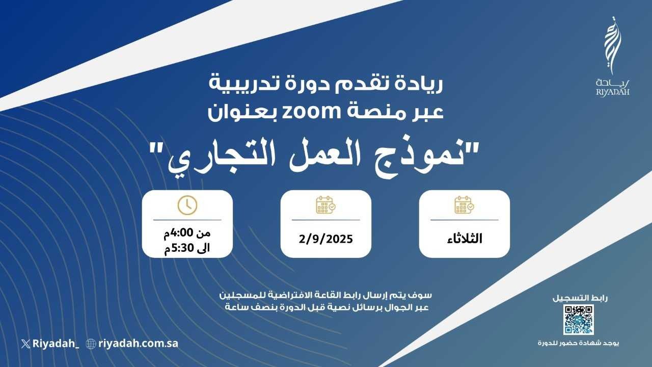 يعلن معهد ريادة الأعمال الوطني (ريادة) دعوته لروّاد ورائدات الأعمال والمهتمين بريادة الأعمال لحضور دورة تدريبية عبر منصة (Zoom)، بعنوان (نموذج العمل التجاري) بشهادات معتمدة (حضور)، وذلك وفقاً للتفاصيل الموضحة أدناه.