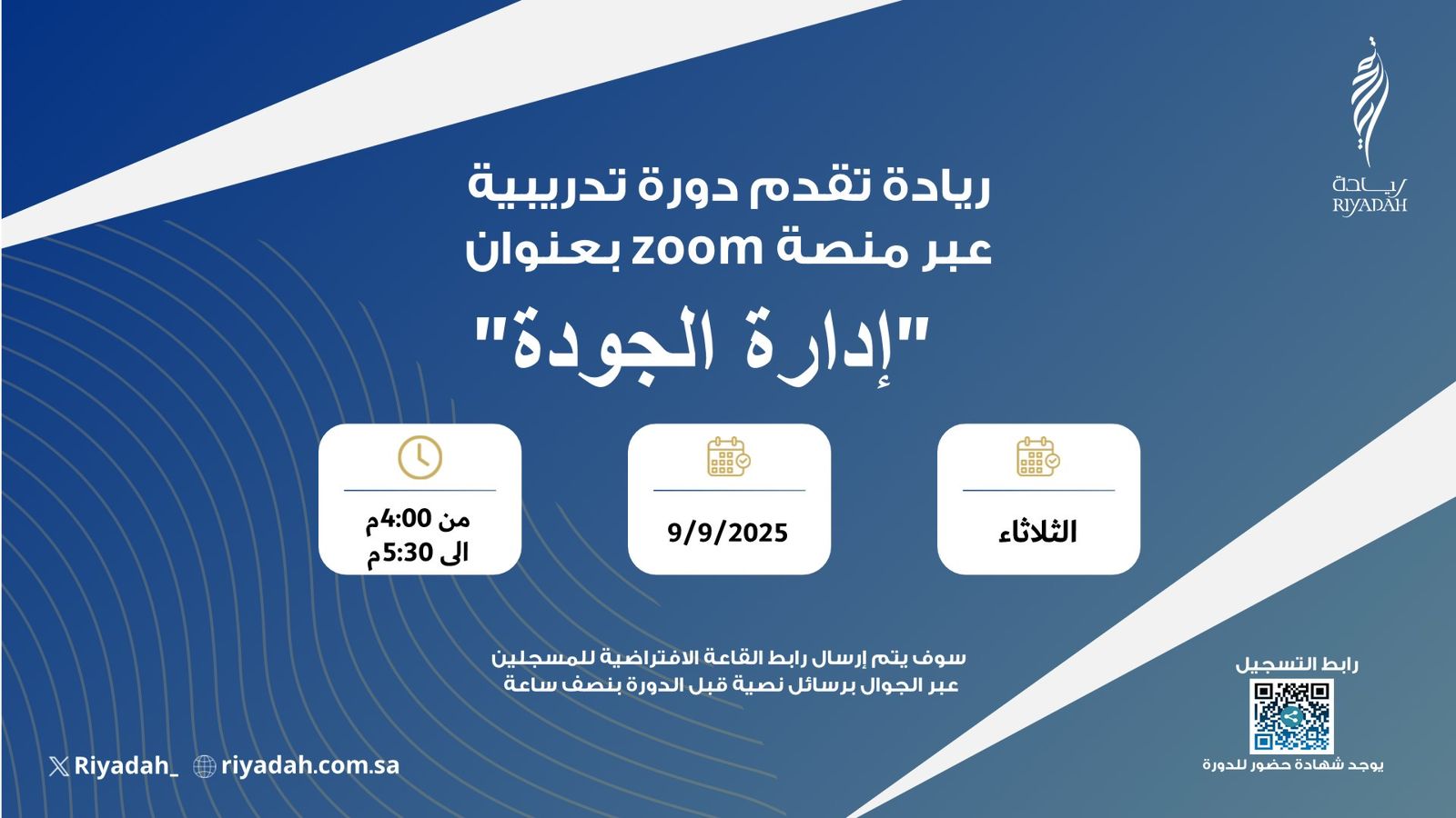 يعلن معهد ريادة الأعمال الوطني (ريادة) دعوته لروّاد ورائدات الأعمال والمهتمين بريادة الأعمال لحضور دورة تدريبية مجانية (عن بُعد) عبر منصة (Zoom)، بعنوان (إدارة الجودة)، مع توفير شهادة حضور، وذلك وفقاً للتفاصيل الموضحة أدناه.